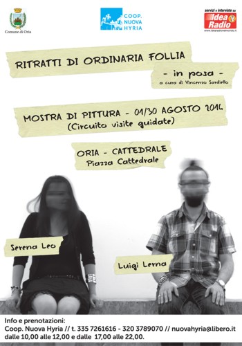 Cooperativa “Nuova Hyria” si arricchisce di un nuovo tassello artistico. Da un’idea di Lucia Locorotondo nasce la mostra “Ritratti di ordinaria follia – in posa” di Serena Leo e Luigi Lerna a cura di Vincenzo Sardiello.A partire dall’1 e sino al 30 agosto nella Cattedrale di Oria sarà possibile visitare questa suggestiva lettura pittorica del contemporaneo che sottolinea l’ordinarietà della follia con cui si vive l’abbandono della soggettività per diventare tutti uguali.
