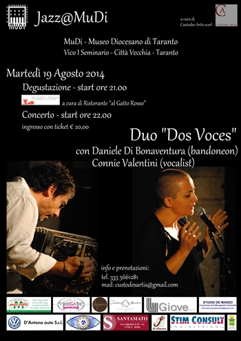 rinnova l’appuntamento musicale Jazz@MuDi. Il suggestivo e accogliente cortile del Museo Diocesano di Taranto ospiterà martedì 19 agosto 2014 Daniele Di Bonaventura & Connie Valentini: “DOS VOCES”.