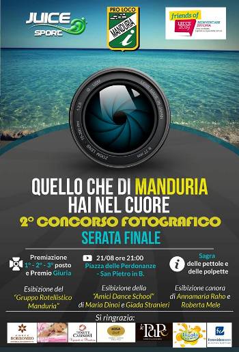 «In continuità con gli eventi che hanno visto piazza delle Perdonanze protagonista dell’estate 2014, non perderemo l’occasione di scoprire, con gli scatti di turisti e villeggianti, questa parte d’Italia attraverso il personalissimo modo di raccontare ciò che della nostra bellissima terra sarà conservato tra i ricordi più cari» si legge in una nota della Pro Loco di Manduria. «Non è un caso che, per celebrare l’unicità della nostra costa, questa volta la seconda edizione del concorso fotografico “Quello che di Manduria hai nel cuore” (da quest’anno organizzata in partnership con Juice Sport) abbia invitato i concorrenti a puntare i propri obiettivi sull’acqua cristallina del nostro mare, tra le sue onde impetuose, sui diciotto chilometri di spiagge battute dal caldo sole estivo. Lo scellerato progetto dello scarico a mare, infatti, incombe sempre più sulle aspettative di rilancio turistico e le sue inevitabili conseguenze minacciano giorno dopo giorno la trasparenza del litorale ionico».