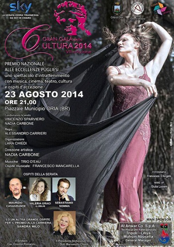 libero presso piazzale Municipio a Oria il “Gran Gala della Cultura” 2014. Si tratta di un premio nazionale istituito nel 2005 che viene assegnato a prestigiosi personaggi pugliesi che si siano distinti nel campo dell’Arte, della Musica, della Scienza e della Cultura in generale.