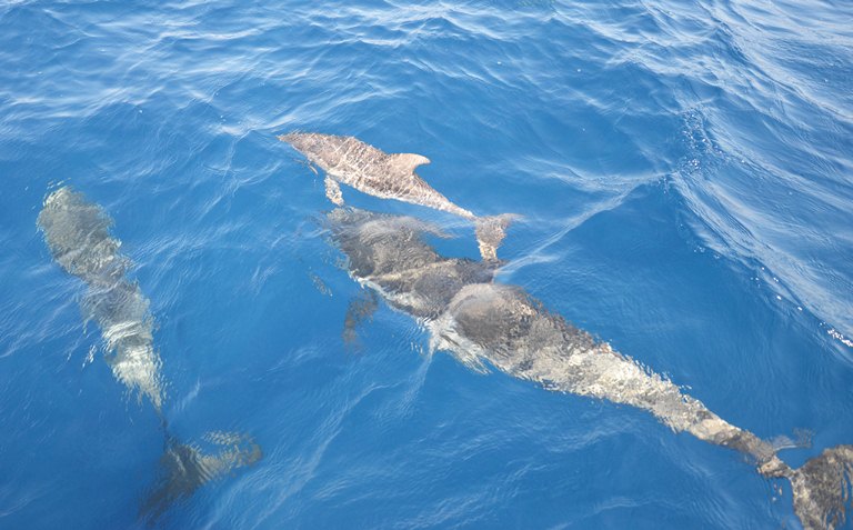 Un evento eccezionale, se si tiene conto che i ricercatori della JDC, durante le campagne di dolphin watching a bordo del catamarano “Taras”, avvistano il Grampo meno di dieci volte l’anno, mentre quasi ogni giorno – la JDC vanta una percentuale di avvistamento del 93/95% – documentano la presenza nel Golfo di Taranto di numerosissime colonie stanziali di Stenella striata (Stenella coeruleoalba), delfinidi che hanno dimensioni minori, un paio di metri di lunghezza, ma che sono soliti avvicinarsi in piena libertà al catamarano Taras per la gioia degli ospiti.