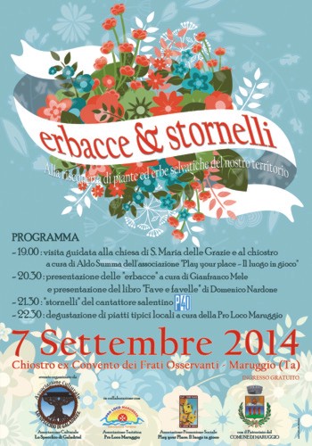 La serata, realizzata grazie alla collaborazione con la Pro Loco di Maruggio e con l’associazione “Play your place – Il luogo in gioco” (nonché con il patrocinio del Comune di Maruggio), è finalizzata alla riscoperta delle piante e delle erbe selvatiche tipiche del territorio, un tempo usate dai nostri nonni per le necessità di tutti i giorni.