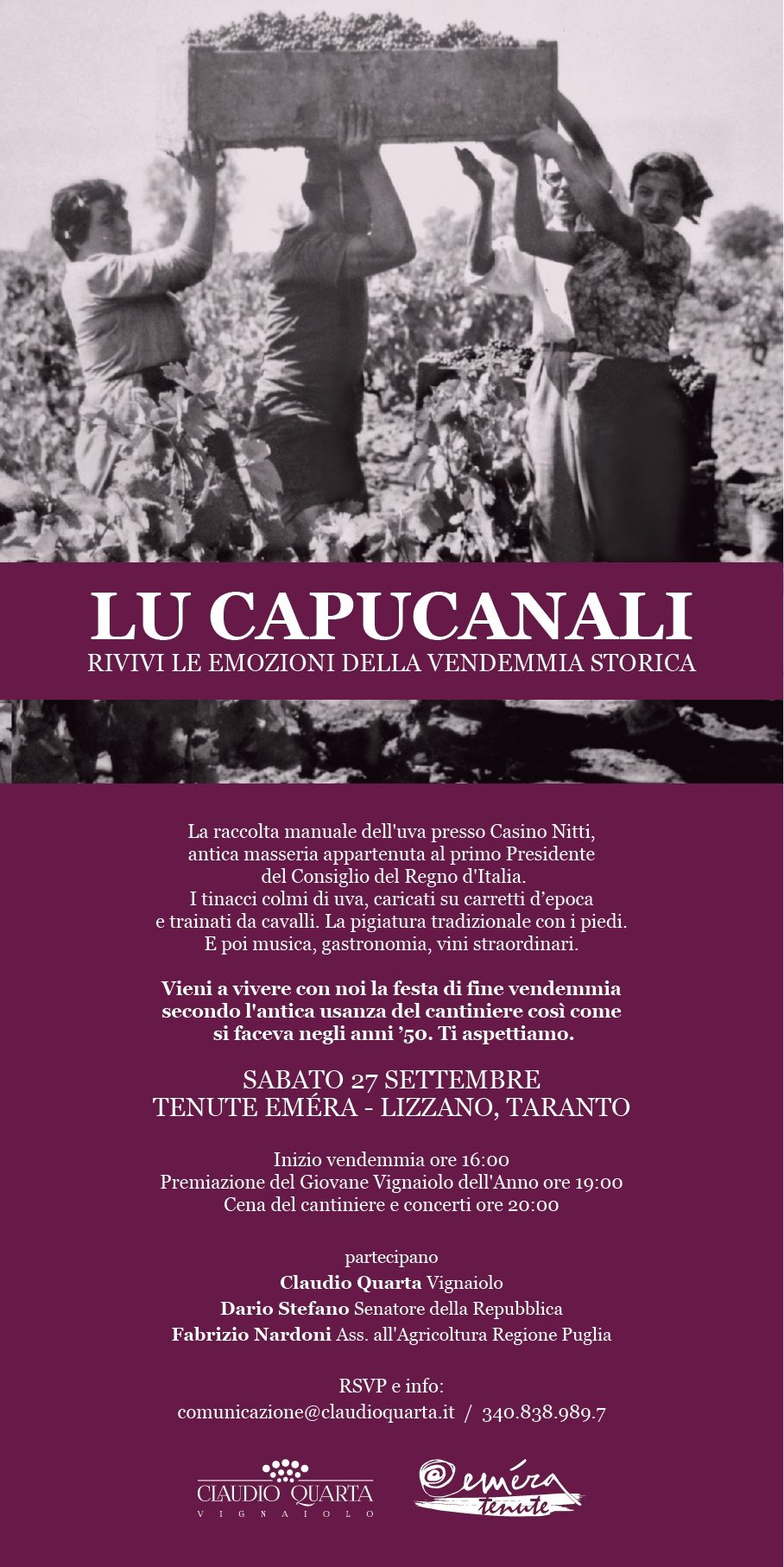 Incontro alle ore 16 presso Tenute Eméra a Lizzano per dirigersi ai vigneti di “Casino Nitti”, storica tenuta di caccia di Francesco Saverio Nitti, primo Presidente del regno d’Italia nel primo dopoguerra (19-20).