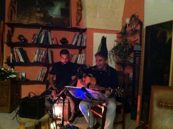 Subito dopo l’introduzione del relatore, Leo Tenneriello (voce, chitarra, armonica) ha eseguito svariati suoi brani originali, accompagnato da Francesco “Cisky” Chiarelli, talentuoso percussionista crispianese. Una serie di composizioni intimiste, introspettive, raffinate ed elegantemente ironiche, impreziosite da testi decisamente interessanti e mai vacui intellettualmente. Il percussionista Chiarelli, con acuta intelligenza artistica, ha sostenuto impeccabilmente Tenneriello sfoggiando un groove assai solido, profondo e puntuale. Dunque, un evento che indubitabilmente ha lasciato un segno tangibile dal punto di vista culturale, arricchito dal numeroso e attento pubblico che ha gremito la sede dell’Associazione Culturale Salentina, promotrice della serata.