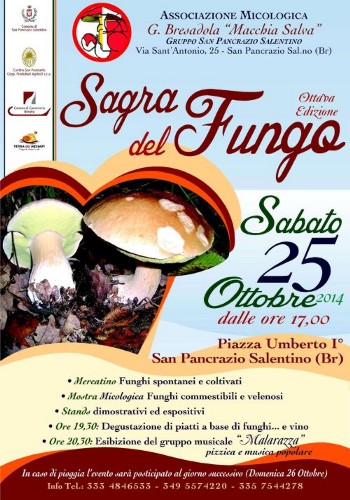 “Macchia Salva”, con il patrocinio del Comune di San Pancrazio Salentino, delle Cantine San Pancrazio, della Camera di Commercio di Brindisi e del Gal Terra dei Messapi, organizza, sabato 25 ottobre a San Pancrazio Salentino, l’ottava edizione della Sagra del Fungo.La manifestazione, che si svolgerà in piazza Umberto I a partire dalle ore 17.00, ospiterà al suo interno il Mercatino Funghi spontanei e coltivati, la Mostra Micologica dei funghi commestibili e velenosi e tanti Stand dimostrativi ed espositivi.