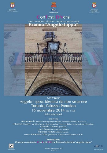 Palazzo Pantaleo (Taranto), sede del museo etnografico “Alfredo Majorano”, sarà la caratteristica cornice del convegno “Angelo Lippo – Identità da non smarrire”, un titolo dal forte potere evocativo riguardante una delle liriche a cura di Lippo, poeta e scrittore tarantino scomparso tre anni fa. In seguito ai saluti istituzionali di rito interverranno il prof. Antonio Basile, docente di Antropologia Culturale all’Accademia di Belle Arti di Lecce, il prof. Salvatore Colazzo, preside di Scienze della Formazione e Scienze Politiche e Sociali presso l’Università del Salento, il giornalista Marcello Cometti, lo scrittore e architetto Lucio Giummo e il poeta e bibliofilo Maurizio Nocera. Antonietta Fulvio, invece, giornalista e presidente dell’associazione “e20Cult”, interverrà in qualità di moderatrice dell’incontro. In seno al convegno si terrà la cerimonia di premiazione della prima edizione del concorso nazionale “ConTesti Diversi – Premio Letterario Angelo Lippo”, con l’indispensabile collaborazione del Comune di Taranto e della casa editrice “Il Raggio Verde Edizioni”.