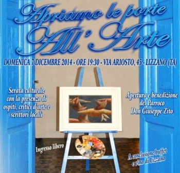 nuovo salotto culturale sito in via Ariosto 45 a Lizzano, con la personale di pittura “Apriamo le porte all’arte” di Pietro Antonio Tocci.La serata, organizzata dallo stesso artista e da Imma Mandrillo con la collaborazione della Confraternita della Misericordia di Lizzano, nasce da una triplice esigenza: celebrare l’arte della pittura, mostrandola ad un presente che troppo spesso cela le proprie bellezze, avvicinare i più giovani, raccogliere fondi per le attività benefiche promosse dalla parrocchia locale.
