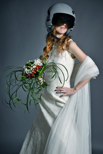 Grazie alla professionalità del fotografo Salvatore Caraglia e alla disponibilità della modella Ilaria Buccolieri, sono state scattate una serie di significative foto all’interno di una delle location simbolo della città di Manduria: il Museo del Primitivo del Consorzio Produttori Vini. La modella indossa un abito da sposa, simbolo di femminilità e maternità. Laura Dattis e Costantina Pasanisi hanno poi pensando di far posare Ilaria anche con un casco autentico da pilota, proprio in omaggio all’impresa di Samantha. Speciale anche il bouquet: è tricolore (come si vede nella foto) essendo composto da peperoncini rossi, da pomodorini verdi e dalla “nebbiolina” bianca.