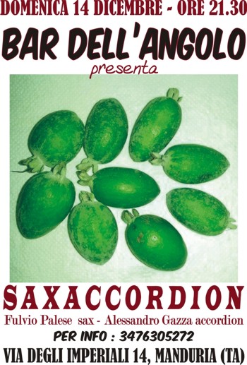 Fulvio Palese incontra le raffinate dinamiche della fisarmonica di Alessandro Gazza. Il risultato è un intenso duo denominato “Saxaccordion” che, sapientemente, fonde il vivido estro del jazz con la prorompente passionalità tipica del tango.Domenica 14 dicembre, ore 21.30, l’accogliente e caratteristico “Bar dell’Angolo” di Manduria (Via degli Imperiali – 14) ospiterà questo duo che eseguirà un repertorio contenente composizioni firmate da: Sonny Rollins, Astor Piazzolla, Richard Galliano, Javier Girotto, Chick Corea, Fulvio Palese e Alessandro Gazza. Dal fraseggio morbido, rilassato e al contempo vivace e muscolare, Palese è un sassofonista di sicuro talento. Grazie alle sue spiccate qualità umane e artistiche ha l’opportunità di collaborare con nomi blasonati della musica, tra i quali: Jerry Bergonzi, Dominique Di Piazza, Phil Maturano, Jimmy Owens, George Cables, John Hicks, Gegè Telesforo, Gegè Munari, Massimo Moriconi, Susanna Stivali. Musicista d’estrazione classica, Alessandro Gazza è un fisarmonicista apprezzato a livello internazionale. Dotato di notevole tecnica unitamente a una pregevole sensibilità artistica tiene svariati e prestigiosi concerti in giro per il mondo, in cui riscuote un eccellente successo di pubblico e critica. Sovente si esibisce in nazioni quali: Inghilterra, Filippine, Serbia, Germania, Svizzera, Albania e Stati Uniti.