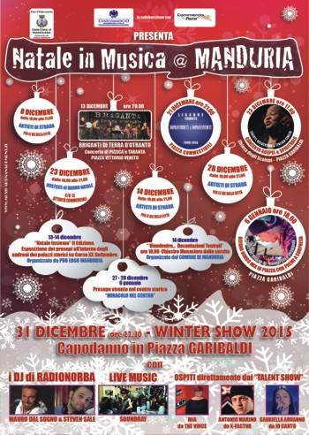 Poi, il 31 dicembre, in piazza Garibaldi, il Winter Show 2015, con i dj di Radio Norba e le esibizioni del gruppo Soundray, di Mia, di Antonio Marino e Gabriella Auranno.