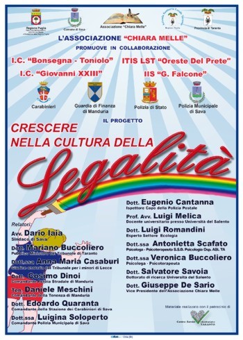 per educare i giovani alla legalità.E’ partito nei giorni scorsi il macroprogetto ”Crescere nella cultura della legalità” che l’associazione “Chiara Melle” organizza in collaborazione con il Comune di Sava, l’istituto comprensivo “Bonsegna–Toniolo”, l’istituto comprensivo “Giovanni XXIII”, l’Itis “Oreste del Prete”, l’Iisg “Falcone”, la Polizia Municipale, i Carabinieri, la Polizia Postale, la Polizia Stradale e la Guardia di Finanza.