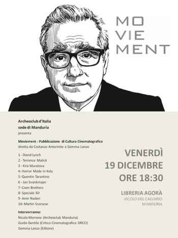 “Moviement”, la collana di cultura cinematografica diretta da Costanzo Antermite e Gemma Lanzo. All’iniziativa, promossa dalla sede di Manduria di Archeoclub d’Italia, interverranno: Nicola Morrone, in rappresentanza di Archeoclub di Manduria, Guido Gentile, critico cinematografico SNCCI, Gemma Lanzo, editrice).«Le monografie Moviement sono dedicate a singoli registi o temi e vedono la collaborazione di studiosi ed esperti del settore nazionali ed internazionali» fa presente il presidente di Archeoclub d’Italia, Sergio De Cillis. «L’incontro, che si terrà il 19 dicembre, alle ore 18.30, nella libreria Agorà, ha il doppio intento di promuovere una realtà editoriale del territorio e di avvicinare il pubblico alla “lettura sul cinema”».