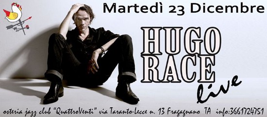Martedì 23 dicembre, alle ore 22, la suggestiva osteria-jazz club “QuattroVenti” di Fragagnano avrà la fortuna e l’onore di ospitare il famoso cantante e chitarrista australiano. Race è un artista di spicco del panorama musicale mondiale. Grazie alla sua forte personalità e al suo ammaliante carisma ha l’opportunità di condividere palco e studio di registrazione con svariati musicisti di levatura internazionale, tra i quali: Nick Cave, Chris Eckmann, Chris Hughes, Catherine Graindorge, Baba Sissoko, Moussa Coulibaly, Pascal Humbert. Numerosi e significativi i progetti discografici in cui Hugo Race è protagonista, come: Hugo Race and True Spirit, Hugo Race Fatalists, Long Distance Operators, Songs With Other Strangers, Dirtmusic, solo per citarne alcuni.