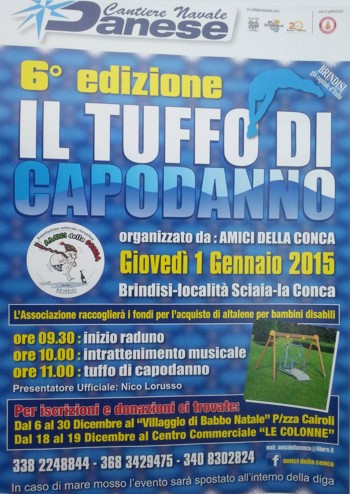 che ha inserito di diritto il capoluogo adriatico nell’elenco delle città mondiali che festeggiano in maniera eccentrica il primo giorno dell’anno nuovo, una tra le poche a prevedere in ogni edizione la raccolta di fondi da devolvere totalmente in beneficenza, l’unica al mondo a prevedere il rito religioso della benedizione delle acque a beneficio della città, della popolazione regionale e di quella nazionale.Giunto alla sesta edizione, il “Tuffo di Capodanno”, in programma mercoledì 1 Gennaio 2015, con raduno alle 9:30, presso “La Conca” sulla litoranea nord di Brindisi - zona Sciaia, è ormai diventato un marchio di fabbrica dell’associazione culturale-ricreativa “Amici della Conca” del presidente Gino Crastolla, realizzato in collaborazione con “Summer Time – Eventi”, il Comando Provinciale dei VV.F. di Brindisi e Radio Ciccio Riccio.