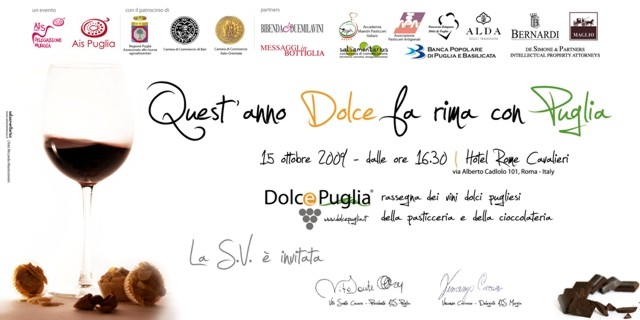 vini dolci pugliesi, della pasticceria e della cioccolateria che giunto alla sua quarta edizione si sposta: dalla Puglia arriva nella Capitale, per far conoscere la dolcezza dei vini pugliesi ad un nuovo pubblico. Il prossimo 15 ottobre 2009 nella prestigiosa location dell’Hotel Rome Cavalieri, la Puglia “dolce” sarà presentata ad una platea esclusiva di appassionati, produttori, buyers e giornalisti. Al suo 4° appuntamento (il 1° fuori dalla Puglia) Dolce Puglia è un’iniziativa culturale e di promozione enogastronomica e territoriale nata da una idea di Vincenzo Carrasso, delegato AIS Murgia, in collaborazione con Bibenda e Duemilavini, vuole contribuire in modo concreto a far crescere la cultura del vino dolce pugliese e il mondo che orbita intorno ad esso. La Puglia, infatti, irraggiata e scaldata dal sole per oltre 2000 ore l’anno, ha le