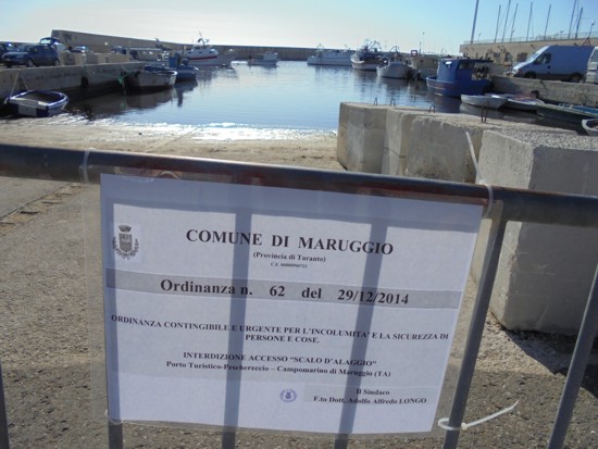 Nonostante una copiosa corrispondenza intercorsa fra le parti (società “Torre Moline” da una parte e Comune di Maruggio dall’altra), i lavori di manutenzione non sono stati ancora eseguiti. Il sindaco pertanto, “per evitare di mettere in grave pericolo gli operatori marittimi in caso di caduta in mare, in quanto le alghe si sono trasformate in vere e proprie sabbie mobili”, ha deciso di emettere l’ordinanza di interdizione del solo scalo di alaggio.