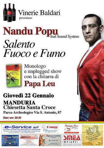Sound System”, presenterà questa sera a Manduria “Salento fuoco e fumo”, un libro che ha scritto poco più di due anni fa, pubblicato da Editori Laterza.Fernando Blasi (questo il suo nome all’anagrafe), sarà a Manduria alle 20,30, nella chiesetta di Santa Croce, poco distante dalla chiesa di Sant’Antonio, su iniziativa delle Vinerie Baldarie. In programma, oltre al monologo dell’autore del libro, anche un unplugged show con la chitarra di un altro artista salentino, Papa Leu.