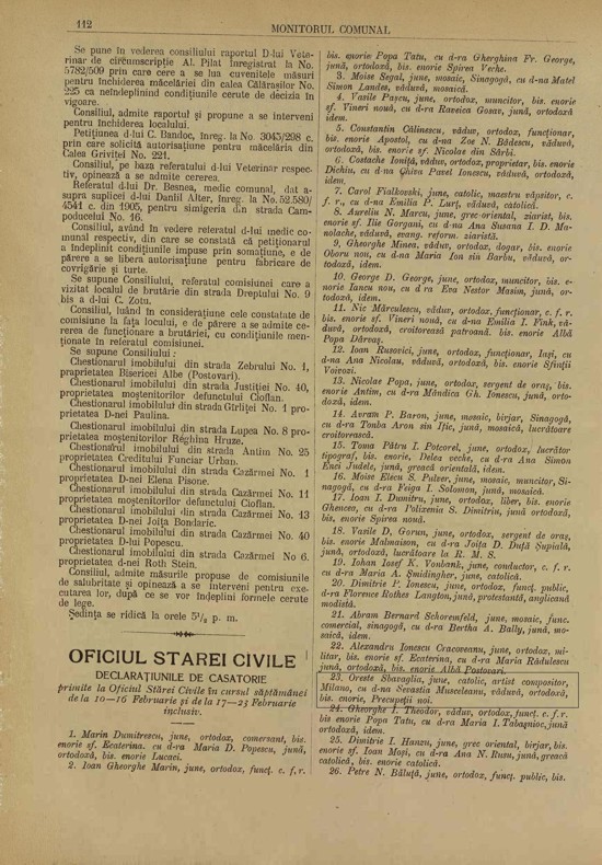 Teatro dell’Opera di Bucarest, del quale lo Sbavaglia avrebbe accompagnato i primi momenti di vita. Il sito internet del teatro (Opera Nationala Bucuresti) è stato, infatti, avaro di notizie sul conto del nostro concittadino. Invece, su una rara copia del bollettino ufficiale del Comune di Bucarest (Monitorul Comunei Bucuresti) del 26 Febbraio 1906, anno XXXI, n.8, ho rinvenuto, con molta fortuna, nella sezione degli annunci dell’Ufficio di Stato Civile (Officiul Starei Civile – Declaratiunile de Casatorie) pag. 112, al n.23, la pubblicazione del matrimonio tra Oreste Sbavaglia indicato in lingua rumena come “june, catolic, artist compositor, Milano” con “d.na Sevastia Musceleanu, vaduva, ortodoxa”, ed è anche specificata la parrocchia di celebrazione delle nozze (“bis. enorie, Precupetii noi”).