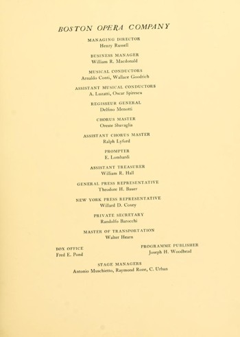 Ancora più proficua è stata, l’indagine relativa all’attività svolta negli Stati Uniti d’America e, più precisamente, nella capitale del Massachusetts, presso il Boston Opera House, uno dei più importanti e lussuosi teatri lirici dell’epoca in America (inaugurato l’8 Novembre 1909