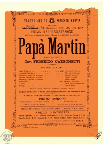rinvenuto alcuni cartelloni riguardanti spettacoli lirici che hanno visto impegnato il nostro concittadino. Trattasi di due manifesti del Teatro Civico “Fraschini” di Pavia, il primo relativo alla rappresentazione del Lohengrin di Richard Wagner, andato in scena il 27 Dicembre 1897, e, il secondo, a quella del Papà Martin opera semiseria di Antonio Cagnoni, andata in scena il 26 Gennaio 1898 (4).