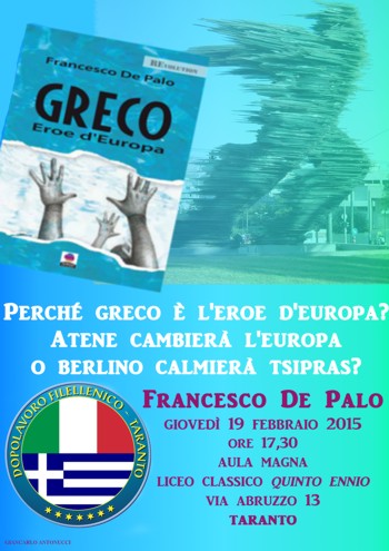 Di ritorno da Atene, dove ha seguito per i suoi giornali l’elezione e le prime mosse europee di Tsipras, e dove la gente è tornata a protestare per le strade spinta dalla nuova speranza di un futuro diverso, De Palo parlerà ai soci e agli ospiti dell'associazione tarantina nell'aula magna del liceo classico Quinto Ennio, in via Abruzzo 13 giovedì prossimo 19 febbraio alle 17,30.