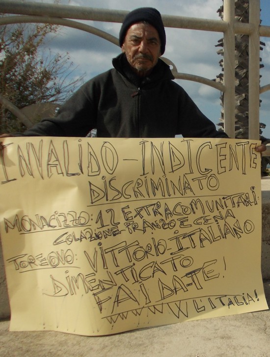 “Invalido, indigente, indiscriminato. A Monacizzo 12 extracomunitari ricevono colazione, pranzo e cena. A Torre Ovo, Vittorio, italiano, dimenticato. Viva l’Italia!”.