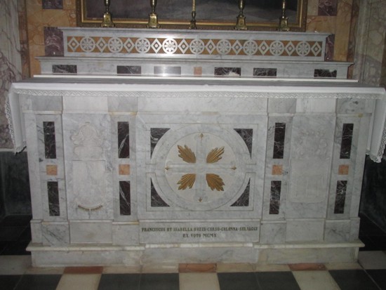 In attesa che qualche volenteroso intraprenda tale studio, vogliamo in questa sede soffermarci brevemente sulla storia di un preciso altare nobiliare, che ci è parsa per più motivi singolare. Ci riferiamo al commesso marmoreo ad intaglio ed intarsio collocato nella chiesa dei PP. Passionisti, il primo della navata laterale destra a partire dall’ingresso. Si tratta di un altare marmoreo policromo piuttosto semplice, caratterizzato da un ridotto postergale ed un ampio paliotto rettilineo scompartito da paraste, che inquadrano una croce greca al centro e due stemmi gentilizi ai lati. All’estremo margine inferiore del paliotto, è collocata l’iscrizione “FRANCISCUS ET ISABELLA BOZZI CORSO COLONNA SELVAGGI EX VOTO MCMX” .
