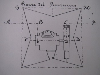 Il castello esibisce appunto una pianta di stella a sei punte, che stupì non poco gli architetti “tradizionalisti” dell’epoca, dalle accuse dei quali Escrivà si difese attraverso il suo trattato. Ma il nuovo modello di fortezza si rivelò quanto di più efficiente potesse esserci, poichè, giocato sulla introduzione del sistema dei bastioni “a tenaglia”, permetteva un più razionale sistema di difesa ed offesa, anche attraverso la sistemazione delle archibugiere a tiro incrociato. Non è da escludere che l’architetto, nell’escogitare il nuovo sistema “a tenaglia”, abbia ripreso lo stesso motivo presente nello stemma dell’ordine di cui era commendatore, sintetizzando così nella nuova tecnica fortificatoria l’aspetto pratico e quello simbolico, come non di rado accadeva agli architetti di quel tempo lontano.