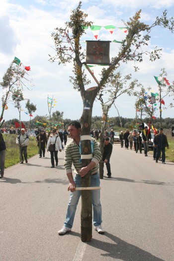In cambio i fedeli offrono preghiere e penitenze. Una, in particolare, ha reso quasi unico questo pellegrinaggio: dalla località di San Pietro in Bevagna sino a Manduria (circa 12 chilometri), migliaia di persone portano sulle spalle, oltre al simulacro del santo, grossi tronchi di alberi, che, attraverso la fantasia popolare, vengono arricchiti da immagini sacre, altarini e sinanche gli attrezzi che si usavano nei lavori in campagna. E’ così che la processione di San Pietro ha acquistato questa sua connotazione arborea.