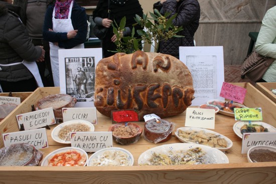 Anche quest’anno, in vetrina, sulle “mattre”, sono stati esposti i piatti poveri di una volta, ormai residuali nella gastronomia, globalizzata, di quest’epoca: legumi (come “ciciri”, “pasuli”, “lenticchia”), e comunque, in gran parte, piatti a base di prodotti della campagna di una volta (“chiappiri”, “tiaulicchi spritti”, “pampasciuni”, “granu sprittu”, “zanguni”, “fai e foji”), con quale variante che prevede ingredienti di mare (“alici fritti spinati”, “cozze ripiene”, “cozze chieni a sugo”, “lajana cu lu baccalai”). Presenti anche i piatti tipici dei giorni festivi per la cultura contadina: “pizzarieddi e purpetti”, e focaccia.