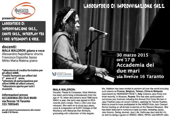 Lunedì 30 marzo, a partire dalle 17, l’Accademia Dei Due Mari (Via Firenze, 16 – Taranto) avrà la fortuna di presentare la masterclass di canto e improvvisazione jazz diretta dalla poliedrica artista americana. Questa clinic sarà rivolta a tutti i jazzisti. Il timbro seducente, intenso e vellutato, unitamente a un pianismo viscerale, fluente e trasudante di fascinose colorazioni bluesy rappresentano i segni particolari della carta d’identità di MalaWaldron.