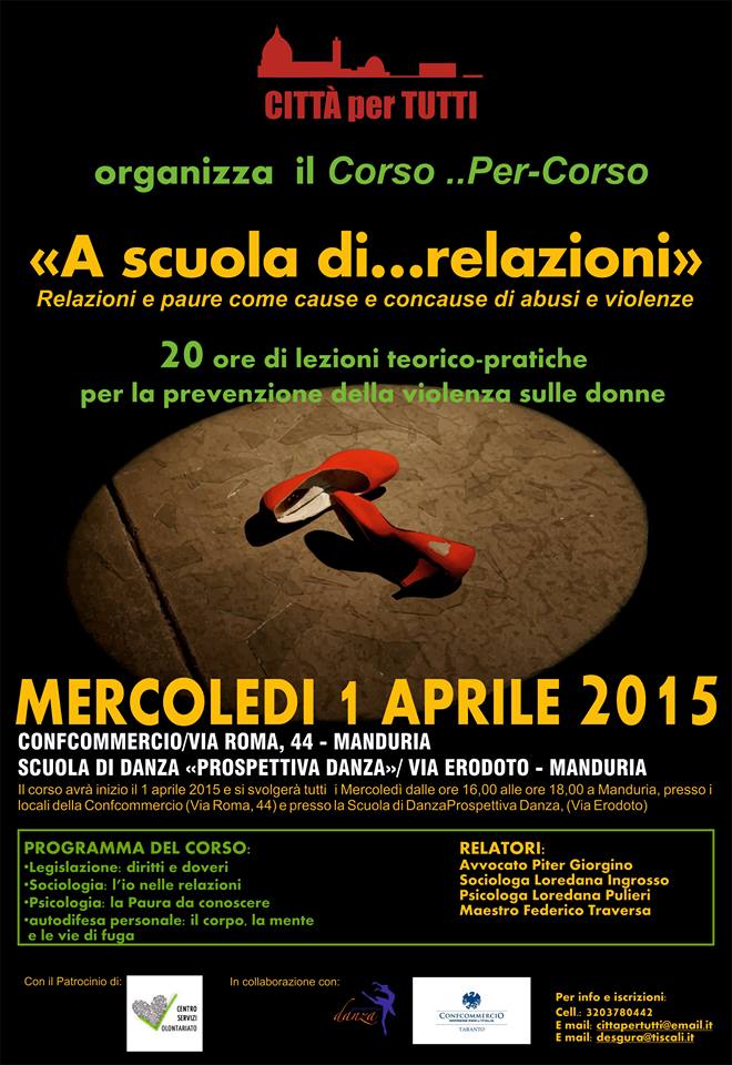 Il corso si svolgerà tutti i mercoledì a Manduria, presso la sala conferenze di ConfCommercio (via Roma 44) e presso la scuola di danza “Prospettiva danza” (via Erodoto), dal 1 aprile in poi, dalle ore 16 alle 18.