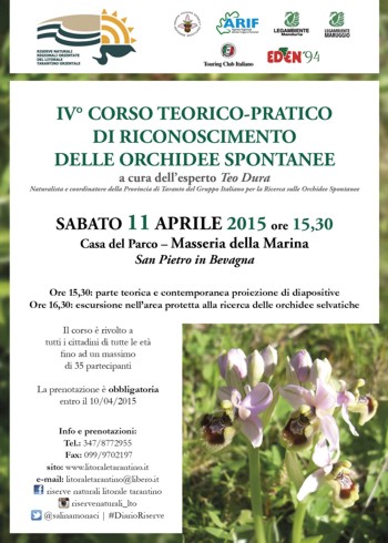 organizzano il IV° corso teorico-pratico sul riconoscimento delle orchidee spontanee. Il corso, che si terrà oggi pomeriggio dalle ore 15.30, prevederà una breve parte teorica che si svolgerà presso la Casa del Parco – Masseria Marina (San Pietro in Bevagna) e, successivamente, si procederà con un’escursione alla ricerca delle orchidee spontanee presenti nell’area protetta ed in particolare al Bosco Cuturi.