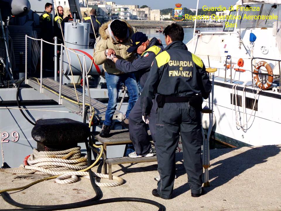 Lo scafo catturato, un gommone di 10 metri, con due potenti motori fuori bordo, veniva trasferito presso gli ormeggi della Sezione Operativa Navale della Guardia di Finanza di Otranto, scortato da motovedette e sottoposto a sequestro e gli scafisti, A. Z. di anni 42 e A. X. di anni 28, entrambi albanesi di Valona, tratti in arresto per favoreggiamento dell’immigrazione clandestina.