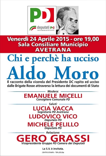 consiliare del Comune di Avetrana l’importante iniziativa portata in giro per l’Italia dal deputato Gero Grassi, “Chi e perché ha ucciso Aldo Moro”.L'iniziativa organizzata dal locale circolo del partito democratico unitamente al gruppo parlamentare del PD vede, tra l'altro, come ospiti i due deputati democratici tarantini Ludovico Vico e Michele Pelillo.