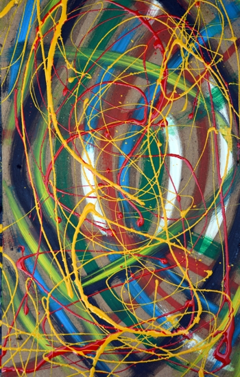 conoscevamo, cioè Mimmo Resta, la cui pittura ha costituito per noi una felicissima quanto inattesa scoperta .L’artista, maturo sul piano professionale, ha in passato realizzato un gran numero di tele di varie dimensioni, le quali, unite ad un piccolo gruppo di sculture, costituiscono un patrimonio culturalmente invidiabile, che andrebbe al più presto catalogato e, se possibile, messo a disposizione del pubblico attraverso una mostra antologica.Le opere realizzate sono sia figurative che astratte: attualmente la ricerca del pittore verte sul recupero del “segno” primitivo, nell’ambito di un ritorno ad una concezione quasi “tribale“ del fare artistico (come ci suggerisce l’amico Fabio Ferretti). Abbiamo dunque assistito ad una piacevole “gara” tra i due creativi, dall’esito significativo: ha iniziato Mimmo, ha concluso