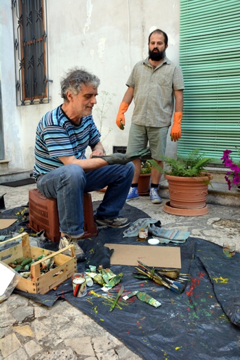 Fabio. Ne sono emerse due opere che, pur partendo dallo stesso schema, sono risultate abbastanza differenti: più libera e sicura quella di Mimmo, che ha proposto una composizione vigorosamente essenziale e cromaticamente calibrata, conclusa poi con un “dripping” di pollockiana memoria; più calcolata quella di Fabio, che si apprezza per il rigore “logico” dello schema.Ma per Fabio la mattinata ha costituito soprattutto la possibilità di ritornare a confrontarsi, per un attimo, con uno dei suoi primi maestri, l’autodidatta Mimmo Resta, e con la sua concezione libera e gioiosa del fare artistico, che non ammette “mediazioni accademiche” di sorta. A noi, cronisti di questa estemporanea “alternativa”, rimane lo stupore per ciò che abbiamo visto, e un pugno di fotografie che ce lo ricorderanno.