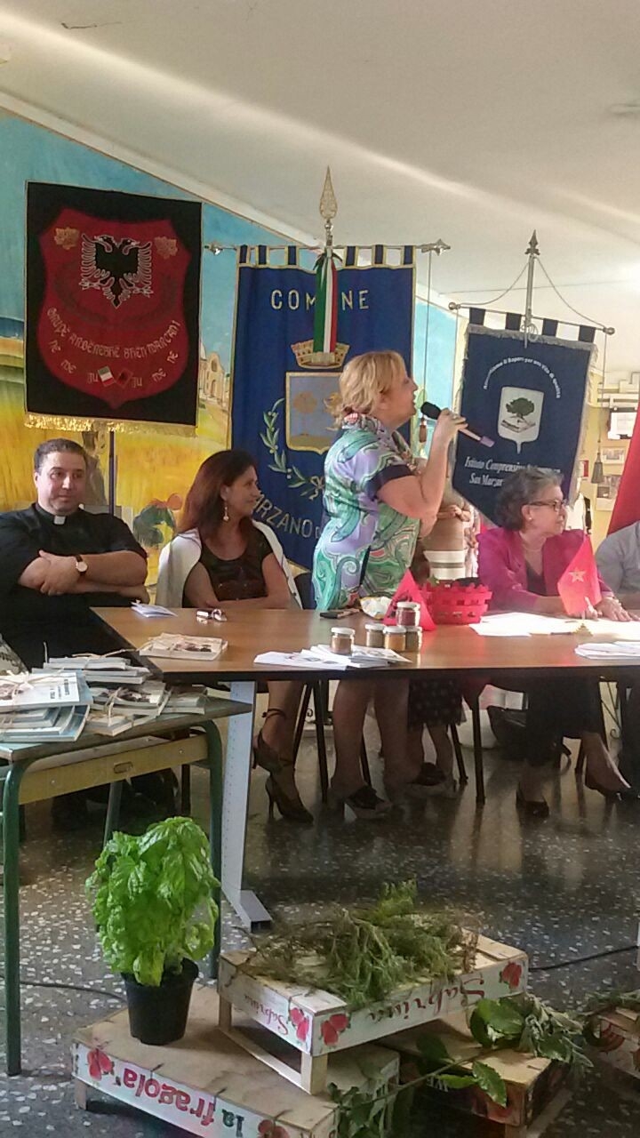 sfilata di costumi della tradizione arberesh, marocchina e dei tempi moderni, l’ascolto di musiche etniche e tradizionali con l’esibizione dei giovani “Desmond e Junior”, della casa famiglia San Damiano di Taranto, e delle nonne di San Marzano.Significative le storie di donne, due marocchine e una albanese, che hanno evidenziato le difficoltà dell’integrazione, la volontà di sentirsi accettate e l’impegno a vivere pienamente la realtà che le accoglie. Dalle donne marocchine, attraverso la voce di Nejet, è venuta la richiesta di alfabetizzazione in lingua italiana per poter seguire i propri figli e assolvere alle più comuni pratiche burocratiche. Sempre Nejet ha proposto lezioni di arabo, con il supporto dell’associazione A.M.A.L. di Porto Cesareo, per i giovani marocchini. La serata si è conclusa con l’impegno da parte della dirigente di avviare, in accordo con l’Amministrazione Comunale, corsi di lingua italiana con docenti dell’istituto che hanno offerto la disponibilità volontaria.