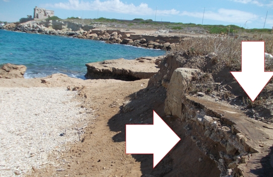 «Già in passato avevo denunciato dei tentativi di scavo da parte di ignoti, praticati in aderenza ad una antica pavimentazione in “opus spicatum”, ma ciò che sta accadendo ora è ancora più grave» sostiene Carrieri. «A seguito di svariati sopralluoghi da parte dei tecnici della Soprintendenza, nell’area sono state riconosciute tracce evidenti di un insediamento costiero, dotato di uno stabilimento per la lavorazione del pesce, databile tra la metà del I° sec. a.C. e il I° sec. d.C., consistenti in setti murari, vasche, vasche pavimentate in “pseudospicatum”, numerose vasche a pianta lobata presenti sul banco roccioso. Esiste anche una particolare concentrazione di frammenti ceramici.