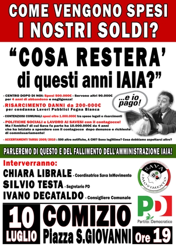 situazione ed informare i cittadini delle tantissime stranezze che investono l'Amministrazione IAIA. Troppi sono gli interrogativi che attendono una risposta, troppe le anomalie e i "danni" che, a nostro parere, questa amministrazione sta producendo per la nostra comunità, e Venerdì 10 alle ore 19 in piazza S. Giovanni a Sava spiegheremo il perchè delle nostre preoccupazioni.L'invito a partecipare è rivolto a tutti i cittadini, le associazioni, le imprese, le forze politiche e tutti coloro che non si rivedono in questo modo di amministrare o che hanno subito direttamente o indirettamente le "vessazioni" di una politica "svolta alla giornata", senza programmazione ne incisività, ma solo "travolta" dagli eventi, che però costa circa 100.000€ all'anno alle nostre tasche.