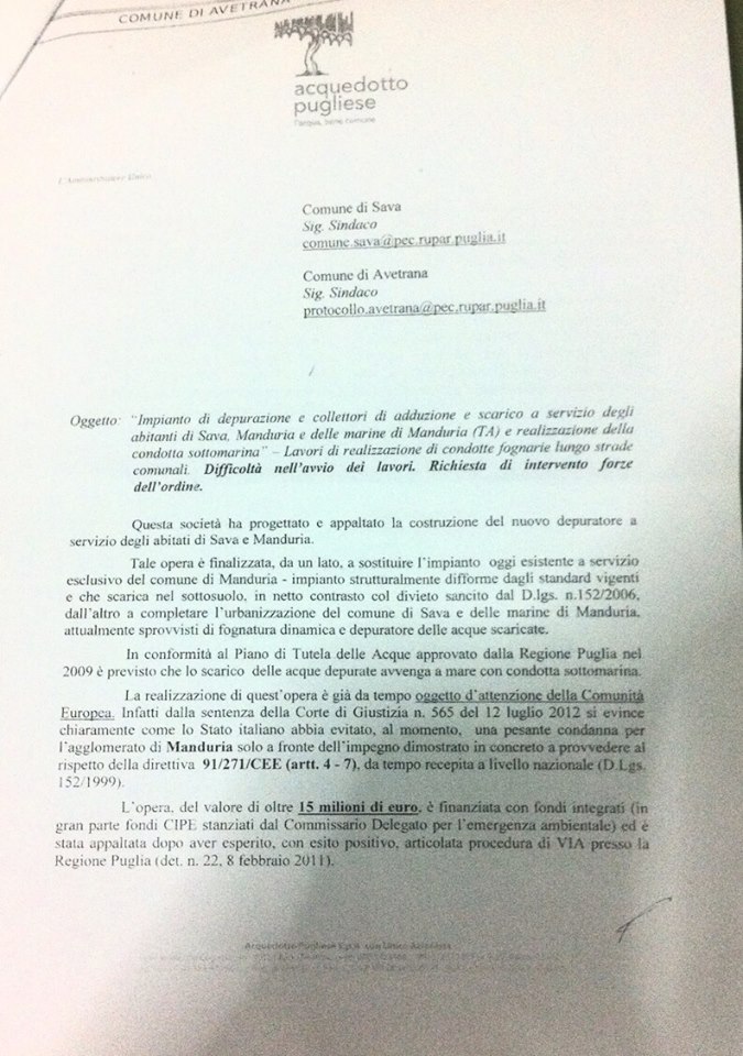 Come abbiamo già fatto notare a più riprese nei giorni scorsi, nel precedente comunicato congiunto del governatore Emiliano e dell’amministratore di Aqp Costantino si faceva riferimento impropriamente alla sospensione dei lavori della condotta sottomarina, poiché, in realtà, non sono mai iniziati, né possono iniziare durante la stagione estiva.