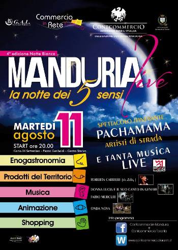 Il primo evento rinviato a Manduria è stato quello promosso dalla locale sezione della Confcommercio: la “Notte dei 5 sensi”, in programma martedì sera in piazza Garibaldi e nel resto del centro della città. Dopo aver verificato le altre date disponibili degli artisti che erano stati coinvolti, la “notte bianca” di Confcommercio è stata rinviata a sabato 23 agosto. Il programma resterà invariato.
