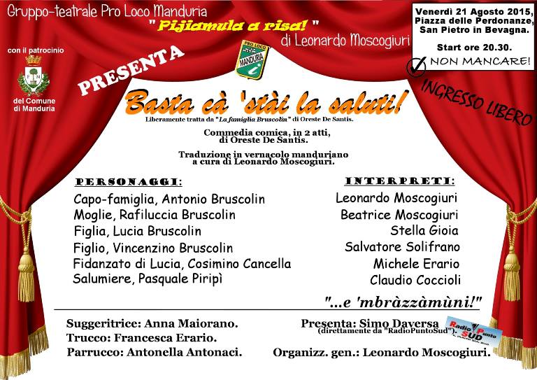 A proposito di risate, ricordiamo che domani (venerdì), alle 20:30, ci sarà poi la serata teatrale con la compagnia della Pro Loco "Pijiamula a risa!" di Leonardo Moscogiuri, con la commedia dal titolo "Basta cà 'stài la saluti!" presso San Pietro in Bevagna, Piazza delle Perdonanze.
