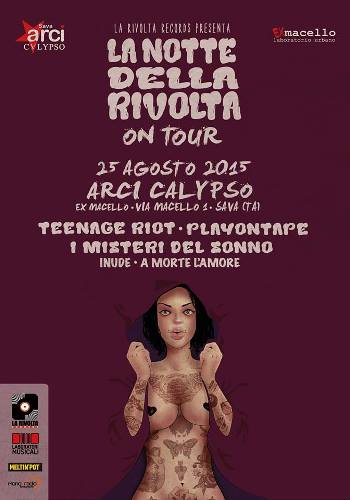 RIVOLTA RECORDS, da quest’ anno LA NOTTE DELLA RIVOLTA va in tour diventando un vero e proprio piccolo festival itinerante in Puglia, dove la musica pugliese viene rappresentata in tutti i suoi aspetti più moderni ed innovativi. Nella cornice del grande spazio esterno del lab urbano Ex macello gestito dall’Arci Calypso di Sava si alterneranno 5 delle più accreditate glocal bands del momento quali: TEENAGE RIOT – PLAYONTAPE - I MISTERI DEL SONNO – INUDE - A MORTE L'AMORE.