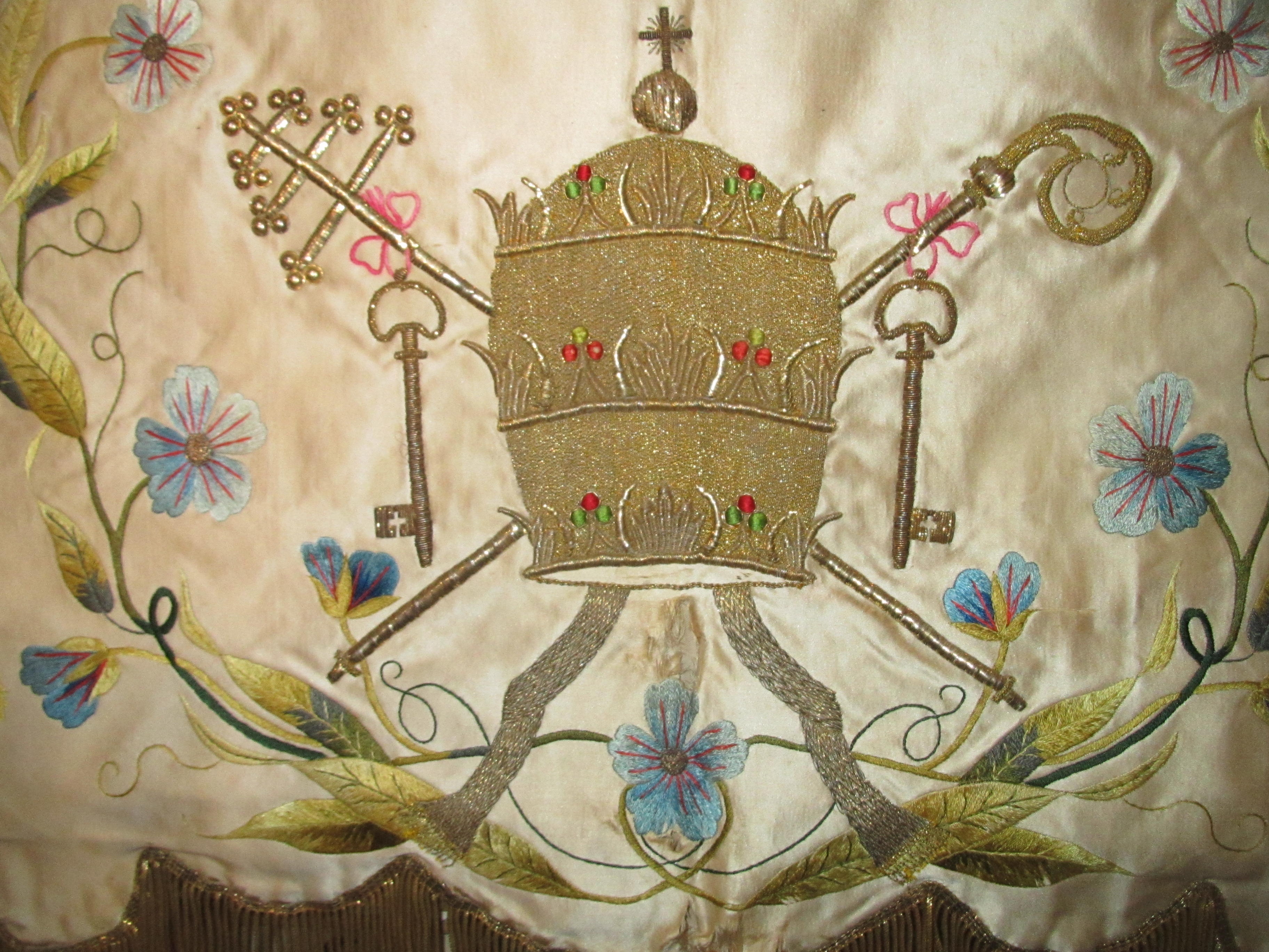 5°Si avviti la croce patriarcale sopra il bottone dorato di uno dei bastoni d’argento, e poi dalla parte di sopra del libro si cali dentro al buco, e da un’altra persona si prenda l’altra metà del bastone d’argento, e si unisca con la vita di ferro del primo pezzo del bastone, e da quella persona, che si e’ calato da sopra la metà del bastone, si avviti fino a che sarà arrivato ad unirsi, confrontarsi l’argento, in maniera che vada bene nel suo disegno; indi lo spuntone di ferro , che sta’ al di sotto, si metta nel buco della basetta fino a che sarà arrivato al piroletto dorato, con avvertenza, che le tre croci di sopra, dove piegano, vadano alla parte di dietro, e dove fa’ pancia, al davanti; ma tutto ciò con accortezza, per non scorticare l’orlo dorato del piviale. Fatto tutto ciò, si accavalla la statua sulla base grande, come si è spiegato di sopra, avvertendo, che sta’ scritto sulla pedagna, quale sia la facciata d’avanti.