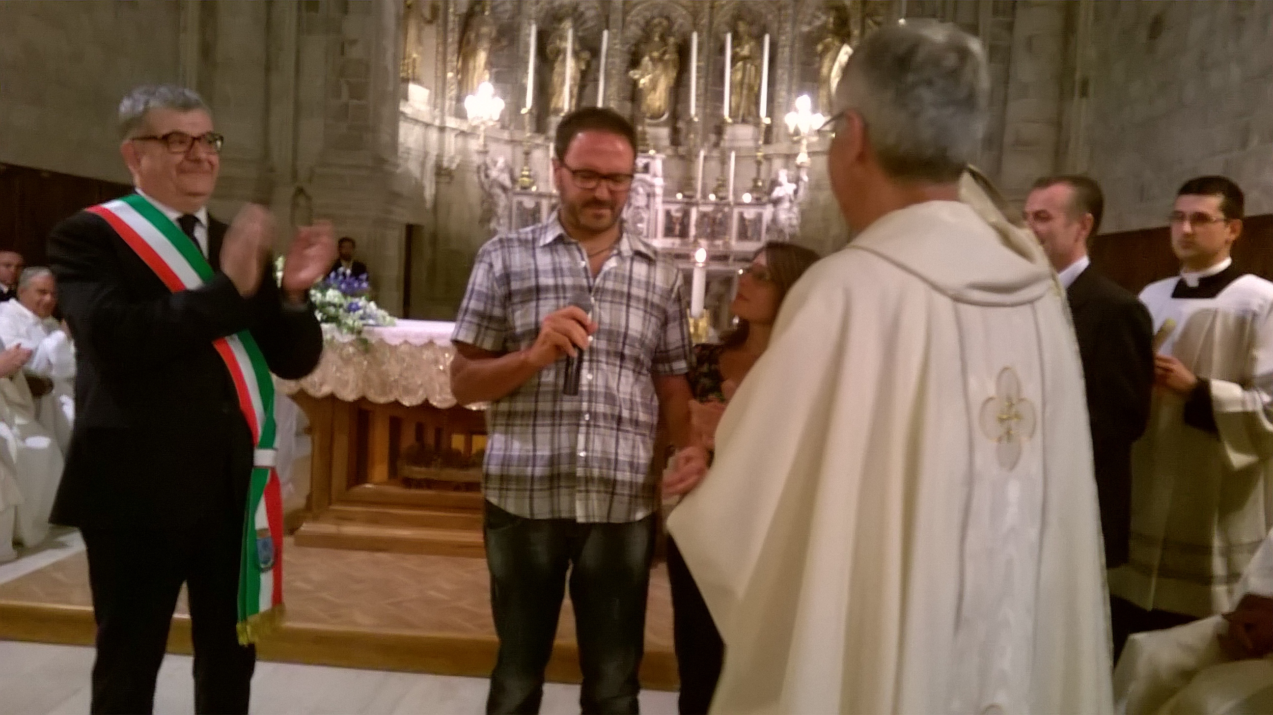 Fra le lacrime di comprensibile emozione, Leonardo Melle ha ricevuto, dalle mani del vescovo di Oria, mons. Vincenzo Pisanello, il Premio San Gregorio Magno