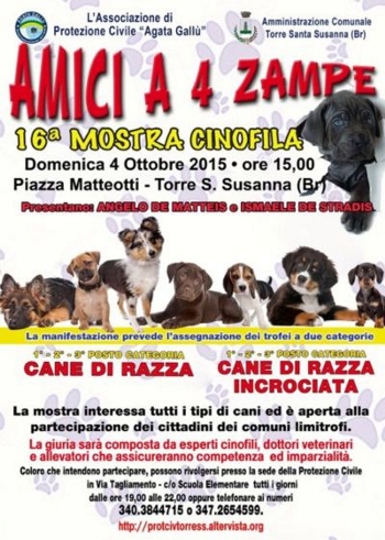 tutta la provincia di Brindisi.A partire dalle ore 15.00 in piazza Matteotti si aprirà ufficialmente la mostra cinofila organizzata dalla Protezione Civile "Agata Gallù" con la possibilità per tutti di incontrare, nei numerosi stand delle associazioni di volontariato, esperti e veterinari per ottenere consigli e suggerimenti utili per aumentare la qualità della vita degli amici a quattro zampe.