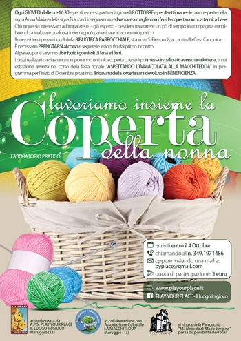 Se dunque sognate ancora di imparare a realizzare da soli la vostra coperta colorata come quella che faceva la nonna o siete già esperte e volete contribuire a realizzarne una insieme, allora il laboratorio “Lavoriamo insieme la coperta della nonna” fa il caso vostro!».