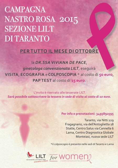 Oltre alle visite senologiche, alle ecografie al seno e alle mammografie, prenotabili in convenzione direttamente presso la Lilt provinciale (099.2211958 e 328.1752630), per tutto il mese saranno infatti disponibili anche servizi di ginecologia a costi particolarmente contenuti. La dott.ssa Viviana De Pace, ginecologa, metterà a disposizione delle tesserate Lilt uno speciale pacchetto in convenzione: visita, ecografia e colposcopia per complessivi 50 euro oppure il solo pap test a 15 euro. Le visite potranno essere effettuate a Statte, Fragagnano, Monteiasi, Lama e Taranto (la colposcopia solo nelle ultime due sedi citate). Le donne che non sono socie Lilt potranno sottoscrivere la tessera Lilt direttamente in occasione della visita, accedendo così ai benefici di questi e di molteplici altri servizi in convenzione. Per informazioni e prenotazioni, occorre telefonare al numero 349.5892595.