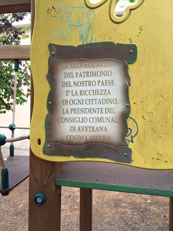 «Ho voluto far risistemare tutte le giostrine per i bambini presenti in piazza Padre Pio» prosegue la presidente Manna. «Erano praticamente inservibili e i bambini del nostro paese sono stati a lungo penalizzati da questa situazione. Poi ho voluto far installare una videocamera di sorveglianza in piazza Unicef, che potrà servire da deterrente verso altri atti vandalici.